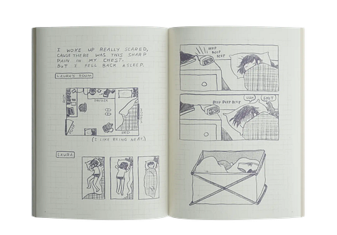 I like how the elements of Laura's life are made conceptually concrete without relying on realism in the art. Mai builds visual depth with intellectual contrast: a panel with nothing but a person in it is anchored to a sense of physical space; the drawing of a girl floats on the page next to a description of how she makes the diarist feel.