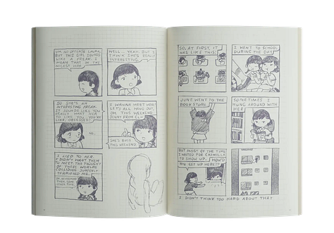 The presence of melancholy might seem like the early, roughneck years of Charlie Brown, but I think Mai's style comes closer to Harvey Comics, the golden age kids' stuff from artists who worked on cartoons and advertising mascots. Vintage, like the dawn of pop culture, by way of sunshine noir like Cosmic Debris' Emily the Strange. Mai's drawings are soft, but her speaking voice is blunt. Laura is an opposite girl (a Harvey tradition, not a gothic one), seemingly sweet but inside, closed.