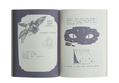 Mai's comics have a lot of illustrations. Which is to say, in addition to the comics — panels through which a sequential story passes — there's lots of narration rendered simply as a journal, text on the page, and then a page with a complimentary illustration. The portraits of Carmilla and the eerie drawings of cat eyes in the night are more Vic Herman than Charles Schultz.